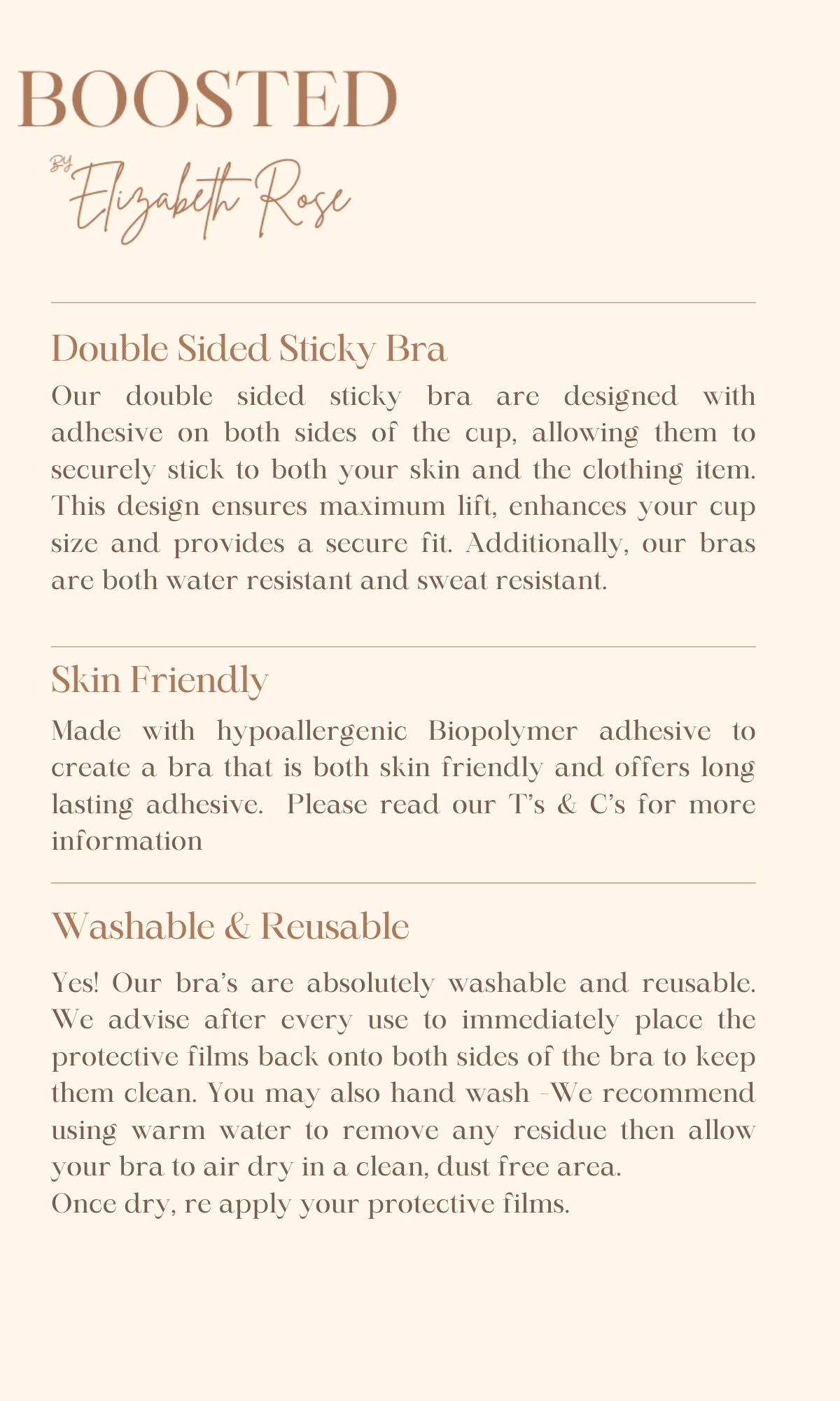 Welcome to www.byelizabethrose.com These terms and conditions outline the rules and regulations for the use of our website and the sale of our product, Boosted - The double sided sticky bra.